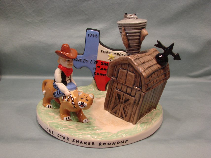 All these sit on a grassy base which has “Lone Star Shaker Roundup” written on it. An outline of the state of Texas rises up from the base. Written on that is “1999 Fort Worth S&P Shaker Club 14th Annual Convention.” A yellow star on the state represents where Fort Worth is located.