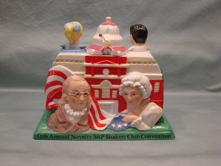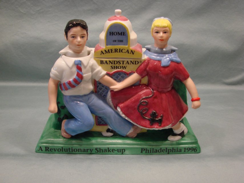 Description: The set is a nodder, turnabout, condiment produced by Fitz & Floyd. The first licensed club set, it is inscribed “Home of the American Bandstand Show” and is licensed by Dick Clark’s company, Olive Enterprises, Inc.