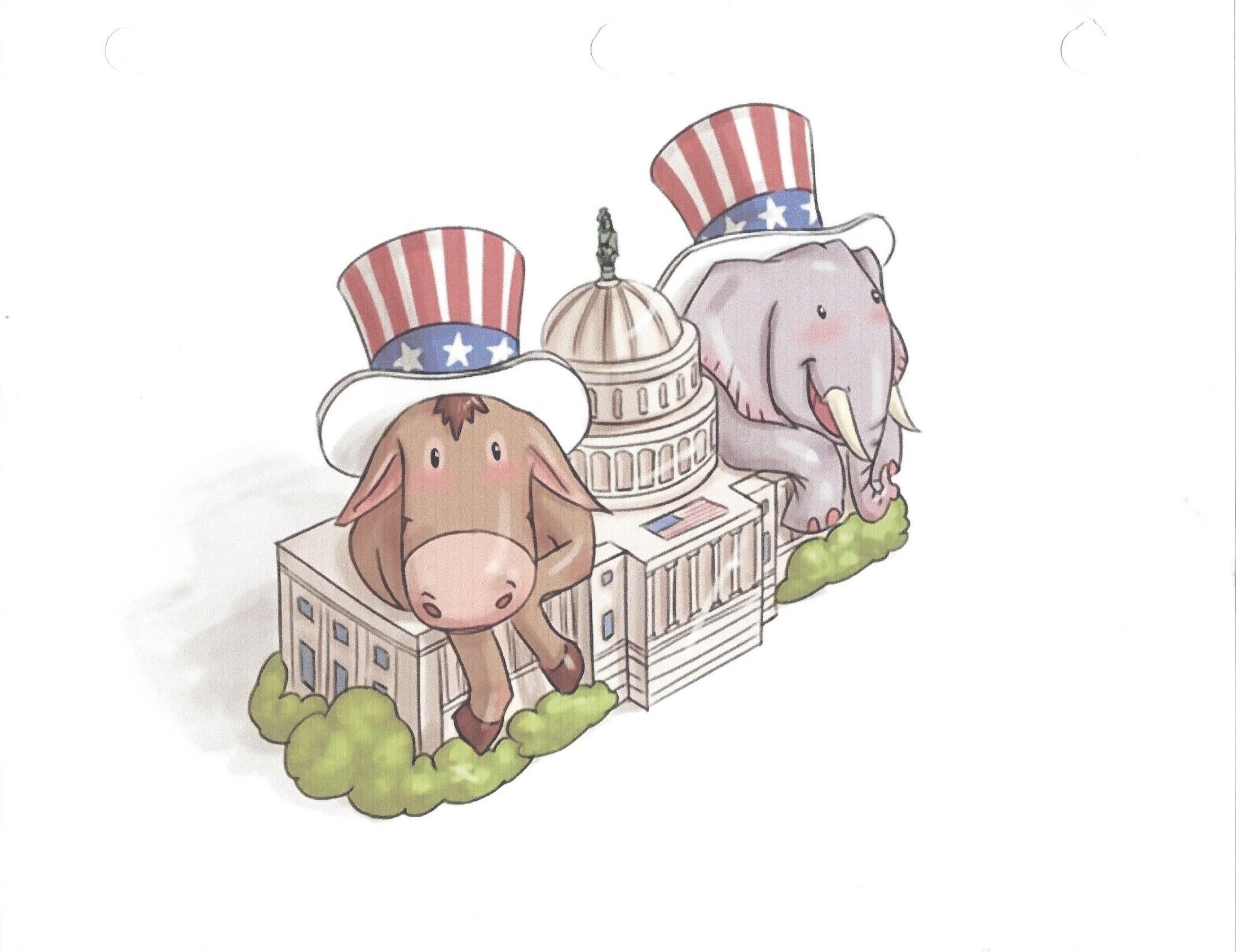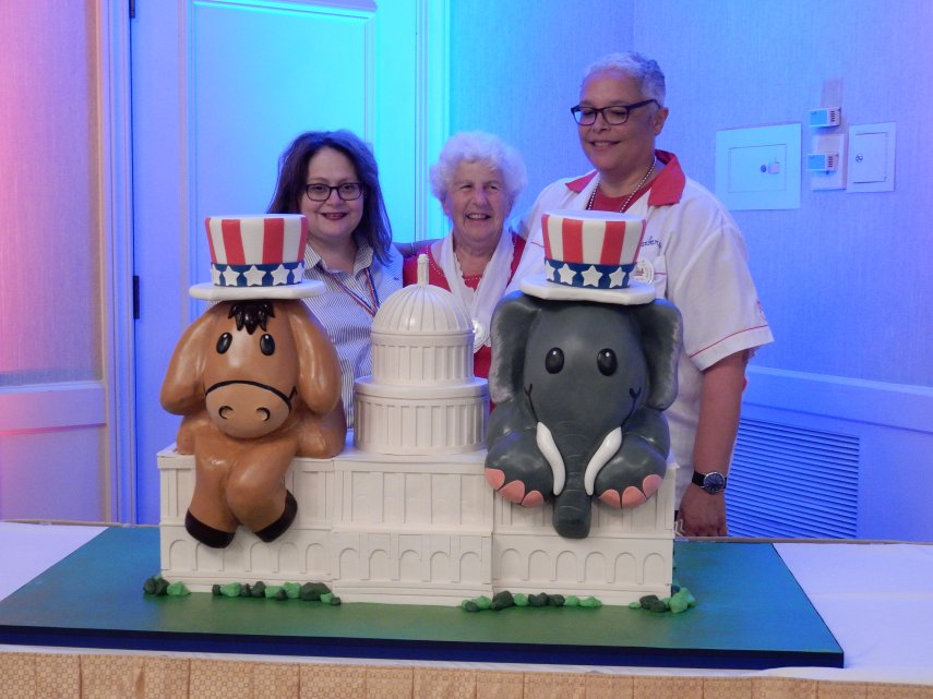 Description: The one-piece set was designed by a New York artist, Ms Xindi Yan, from a rough sketch provided by Barbara Cummings. We wanted to capture the convention theme of “Spice Up the Capitol” and thought that the Capitol Building with the yin and yang/salt and pepper/Democrat and Republican symbols did just that.