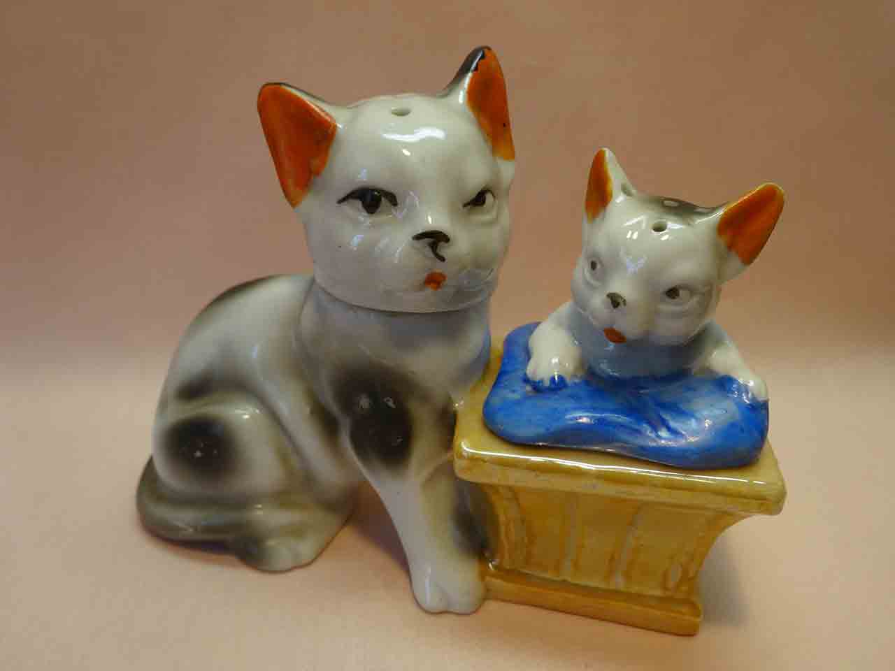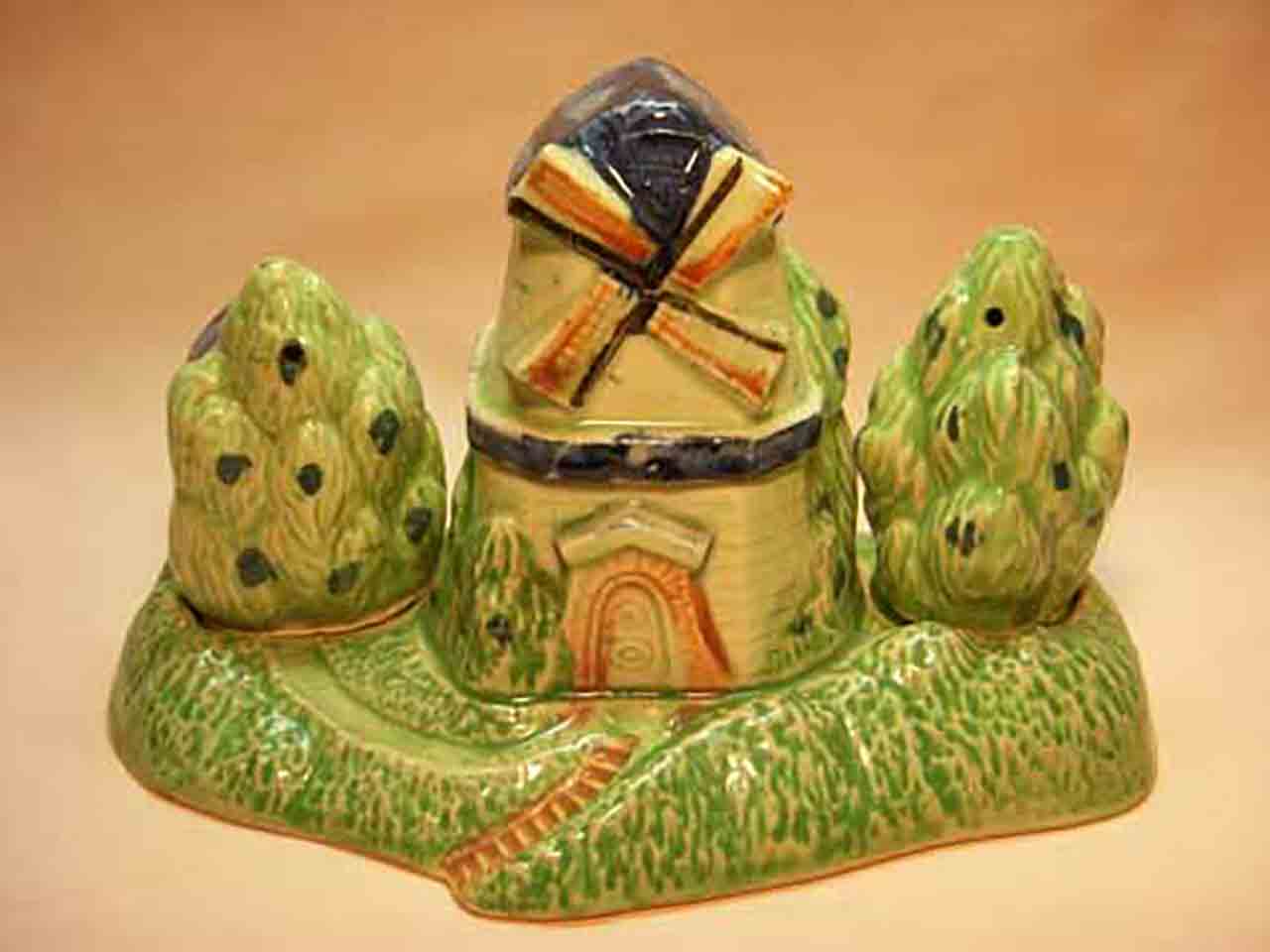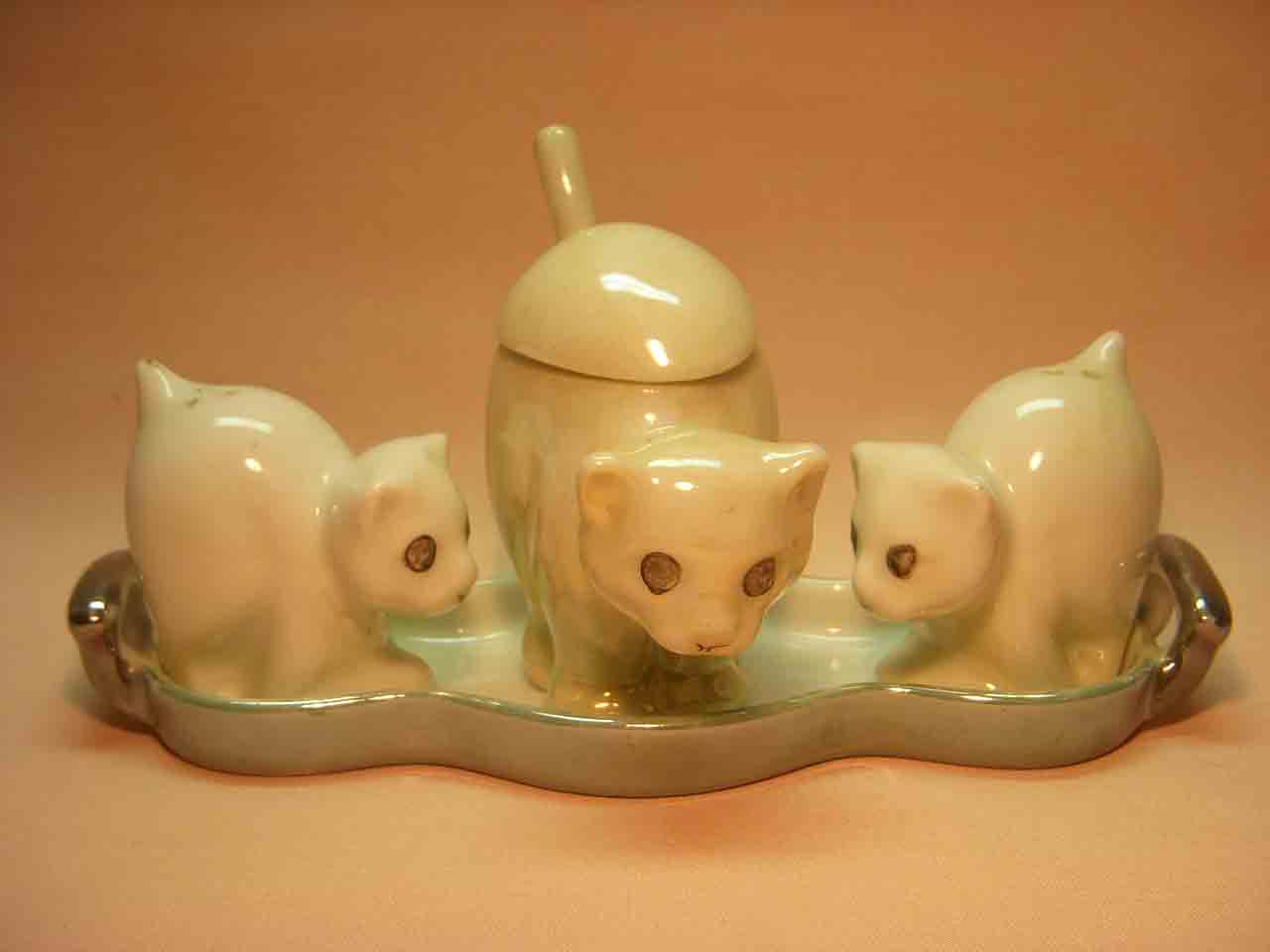 Some very early CONDIMENT SETS have a mustard pot but instead of one or more shaker pieces, have small dish-shaped areas formed in the base with tiny spoons.