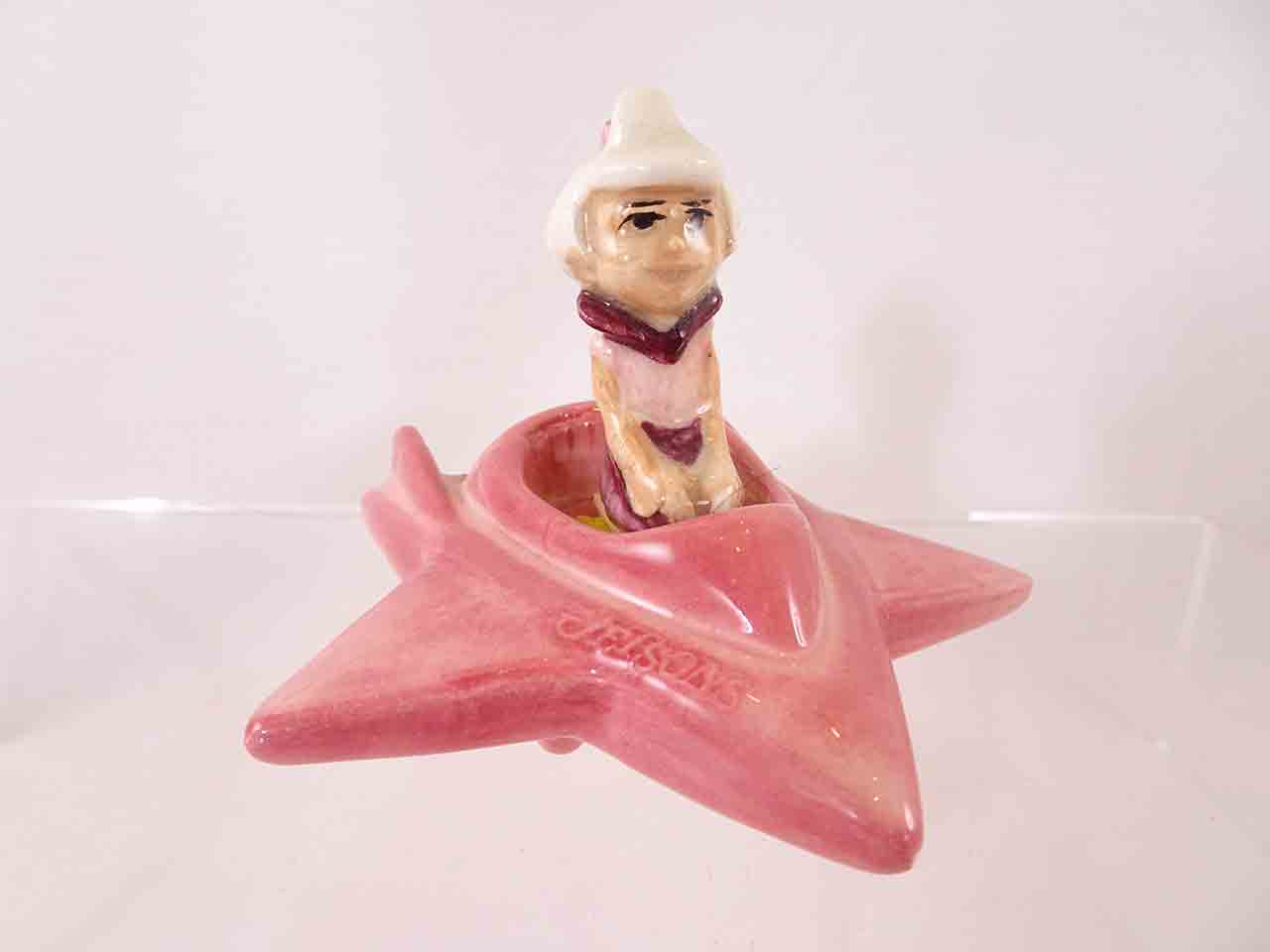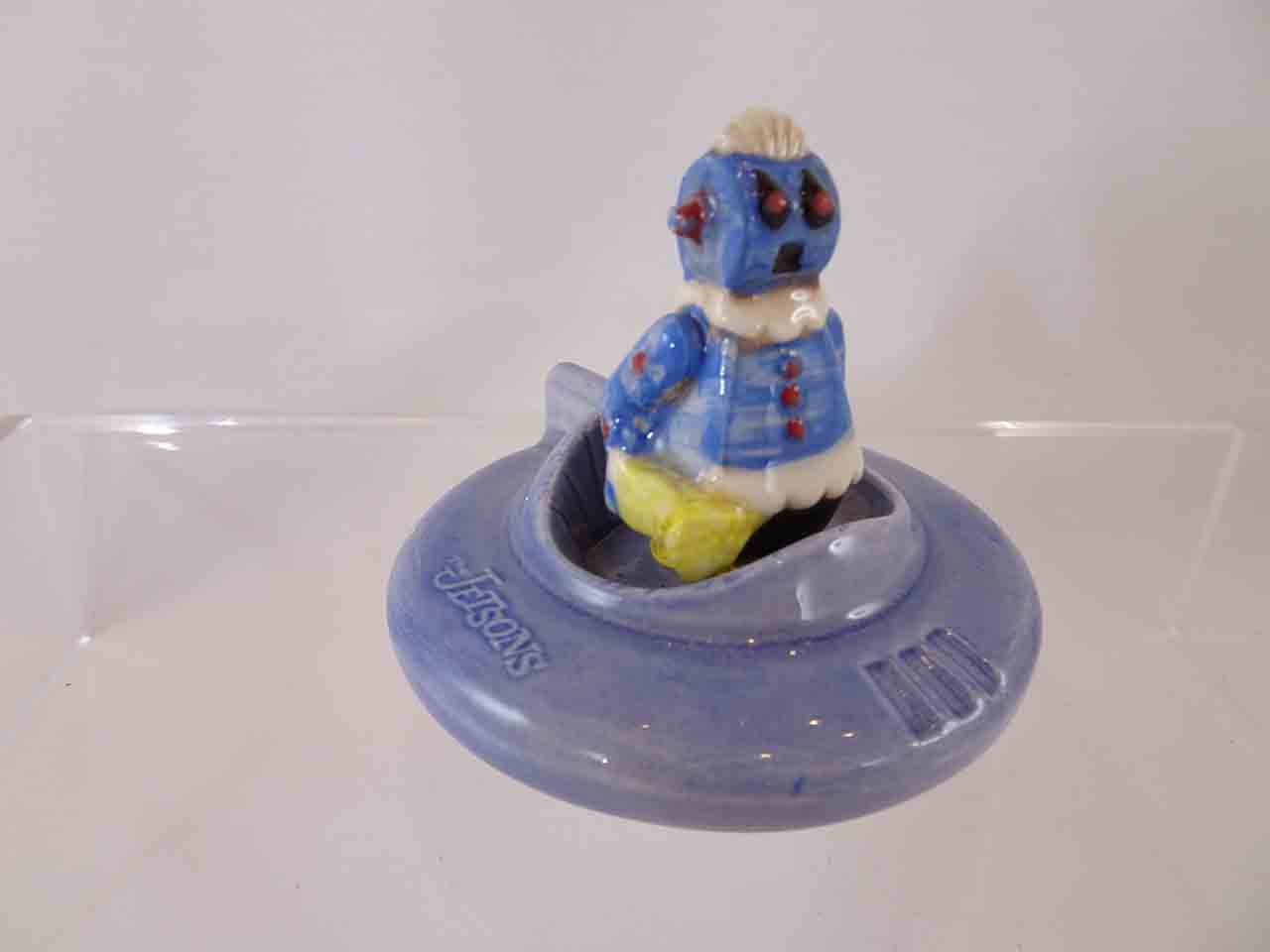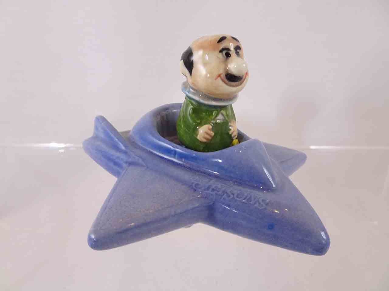 The private ceramicist Linda Sexton made these Jetsons sets around the year 2000. Each set consists of a character from the Jetsons cartoons in a distinct spaceship. We known that the spaceships can be found in various color variations. The sets about 2.75 '' in height with plastic stoppers and are all marked on the bottom with Linda Sexton's characteristic blue flower mark.