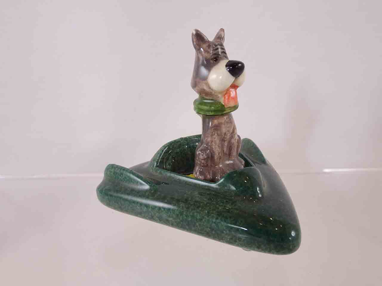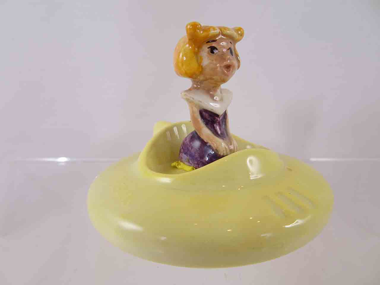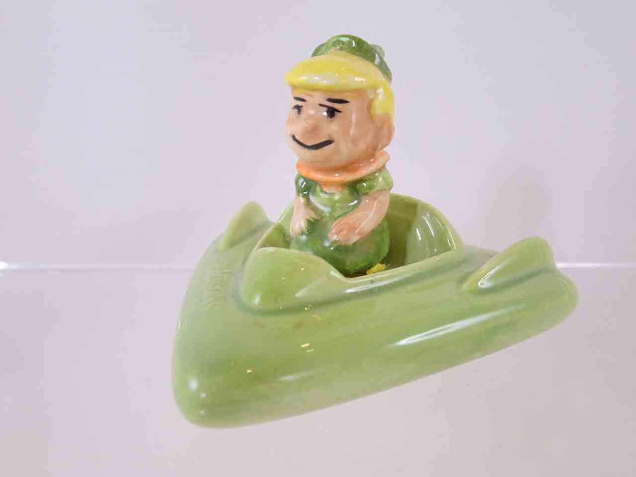 The private ceramicist Linda Sexton made these Jetsons sets around the year 2000. Each set consists of a character from the Jetsons cartoons in a distinct spaceship. We known that the spaceships can be found in various color variations. The sets about 2.75 '' in height with plastic stoppers and are all marked on the bottom with Linda Sexton's characteristic blue flower mark.