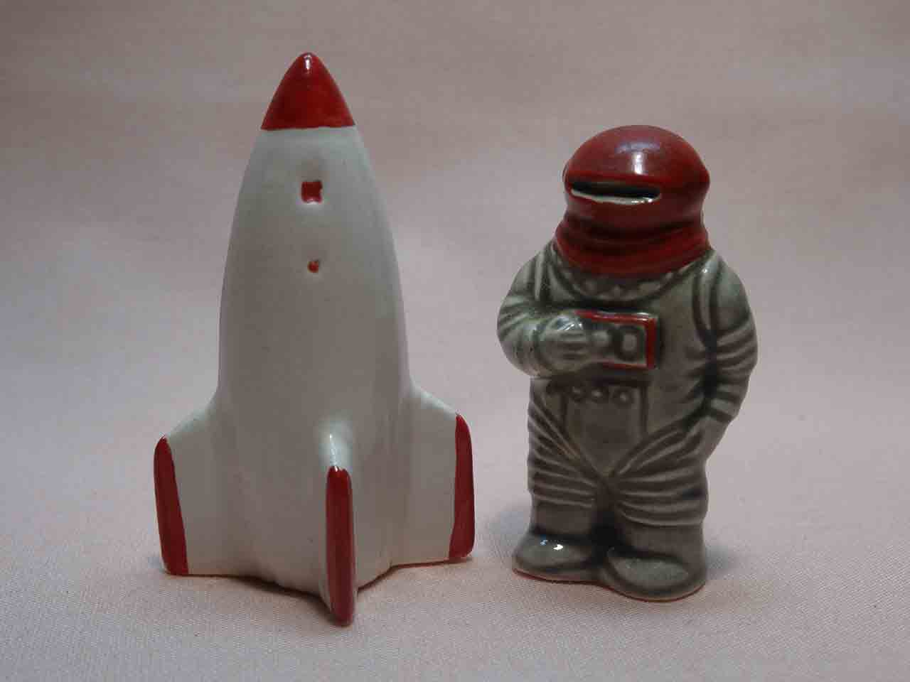 Most collectors are familiar with the Arcadia version of the miniature rocket ship and astronaut, but might have never seen this Japan version. It is also a miniature, standing only about 1.75'' in height. Similar to the Arcadia set, in the Japan version both shakers have only one pour hole. The Japan version has small cork stoppers unlikely the Arcadia set which has a flat base without stoppers. The set is stamped in black "Japan" on the bottom.