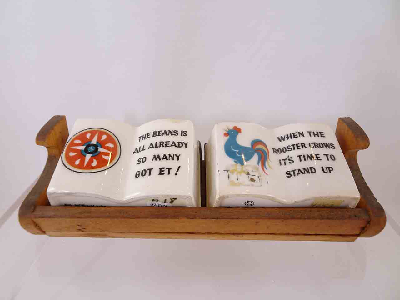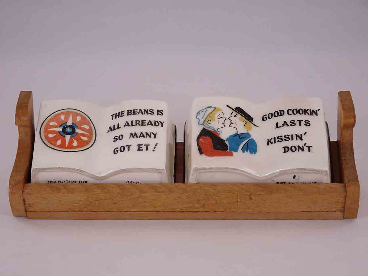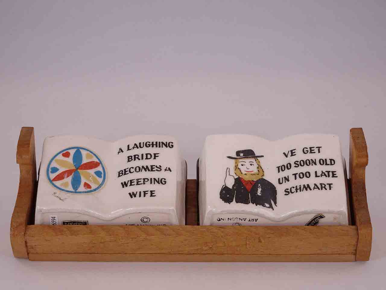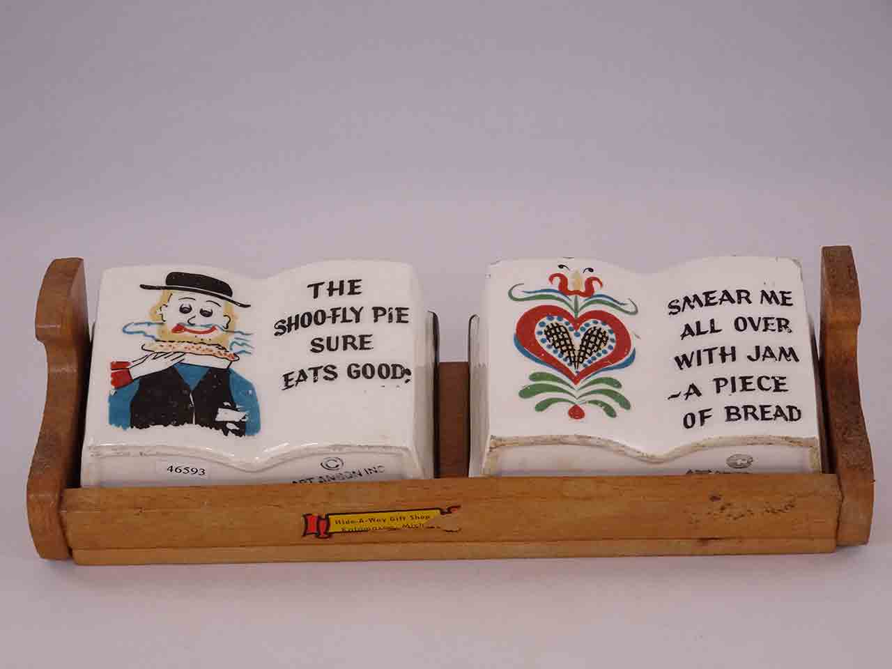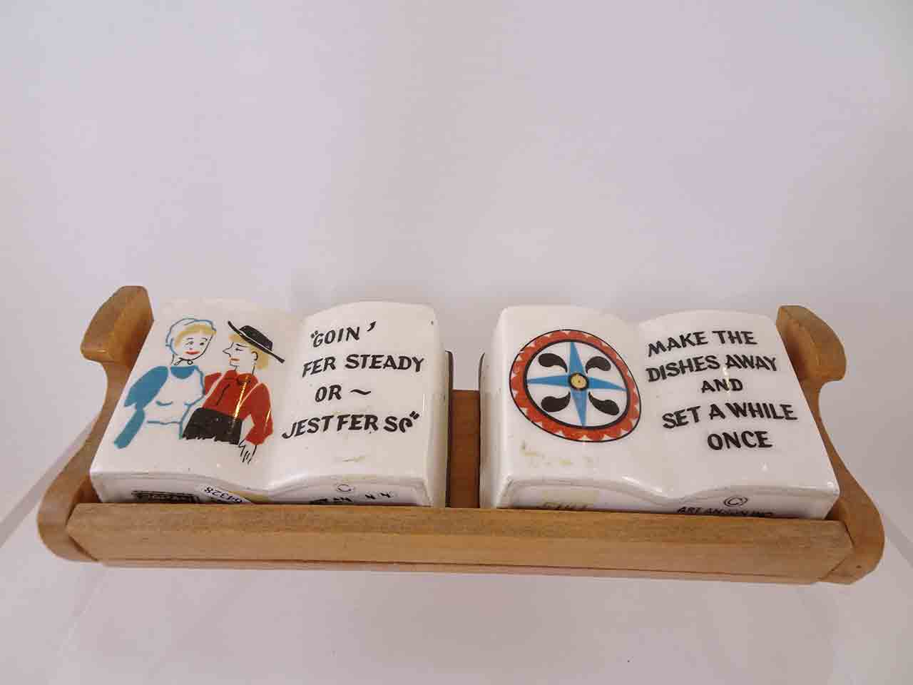 This series of shakers consists of books with various strange old fashion sayings and depictions of Germany / Amish-type folk and decals. Each set is only about 2'' tall and the wood trays about 6'' in length. Some books have 3 holes and some 2 holes. They appear to be found in a variety of combinations and likely more examples exist that are undocumented. Each set is stamped "Art Anson Inc" and some have original Japan paper labels. Circa 1950s-60s.