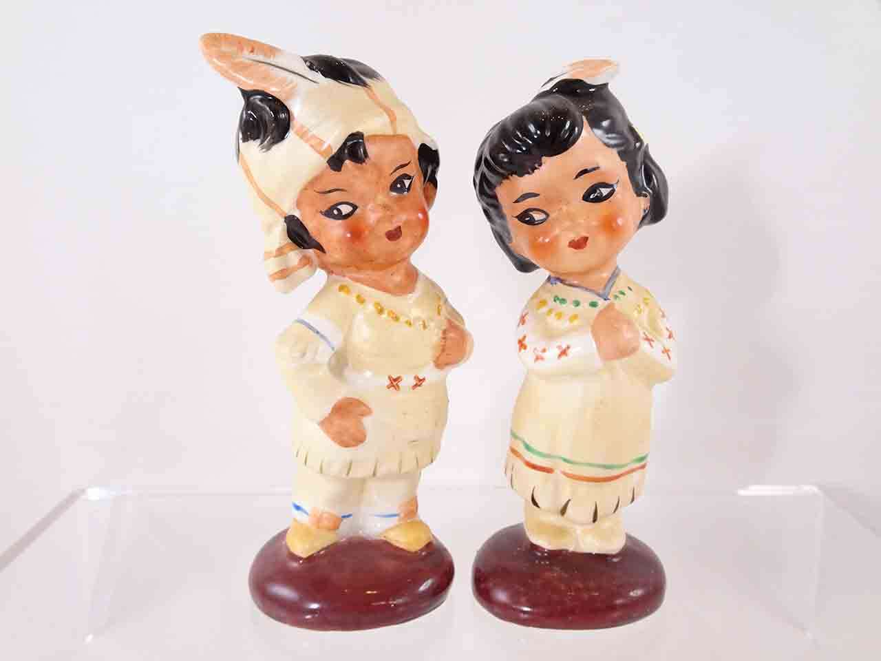 Only two sets of similar Native American children to date have been found creating this small series. Each set has its original "Olimco Japan" import label. The shakers are about 4'' tall with 3&2 pour holes. At first glance, they look like the same set, but each boy and girl are posed differently. Do you know of any others that could be a third in the series?