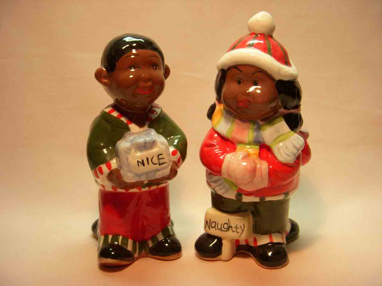 TURNABOUT shaker sets usually consist of two shaker people with a different face and clothing on either side, e.g., a happy bride and groom that when turned around show an aging couple or weary parents, a pair of little school children that when turned around become graduates in caps and gowns, etc.